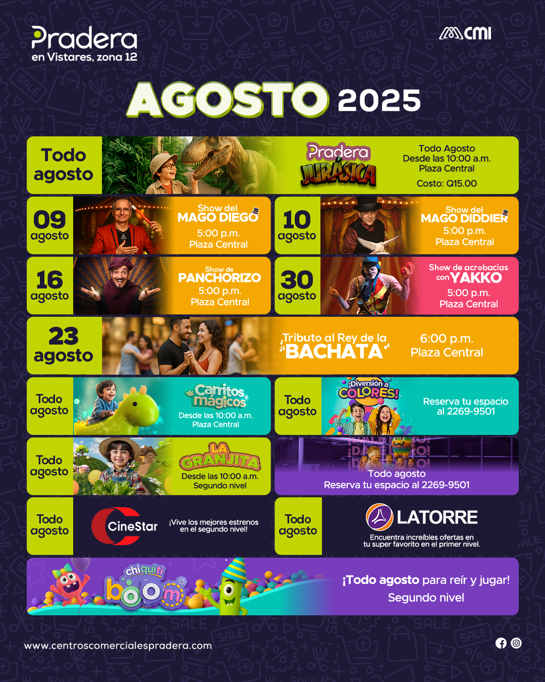 Para más información sobre las actividades, horarios y sorpresas del mes, visita nuestras redes sociales en Facebook: Pradera Vistares, o consulta el sitio web oficial en: https://centroscomercialespradera.com/vistares