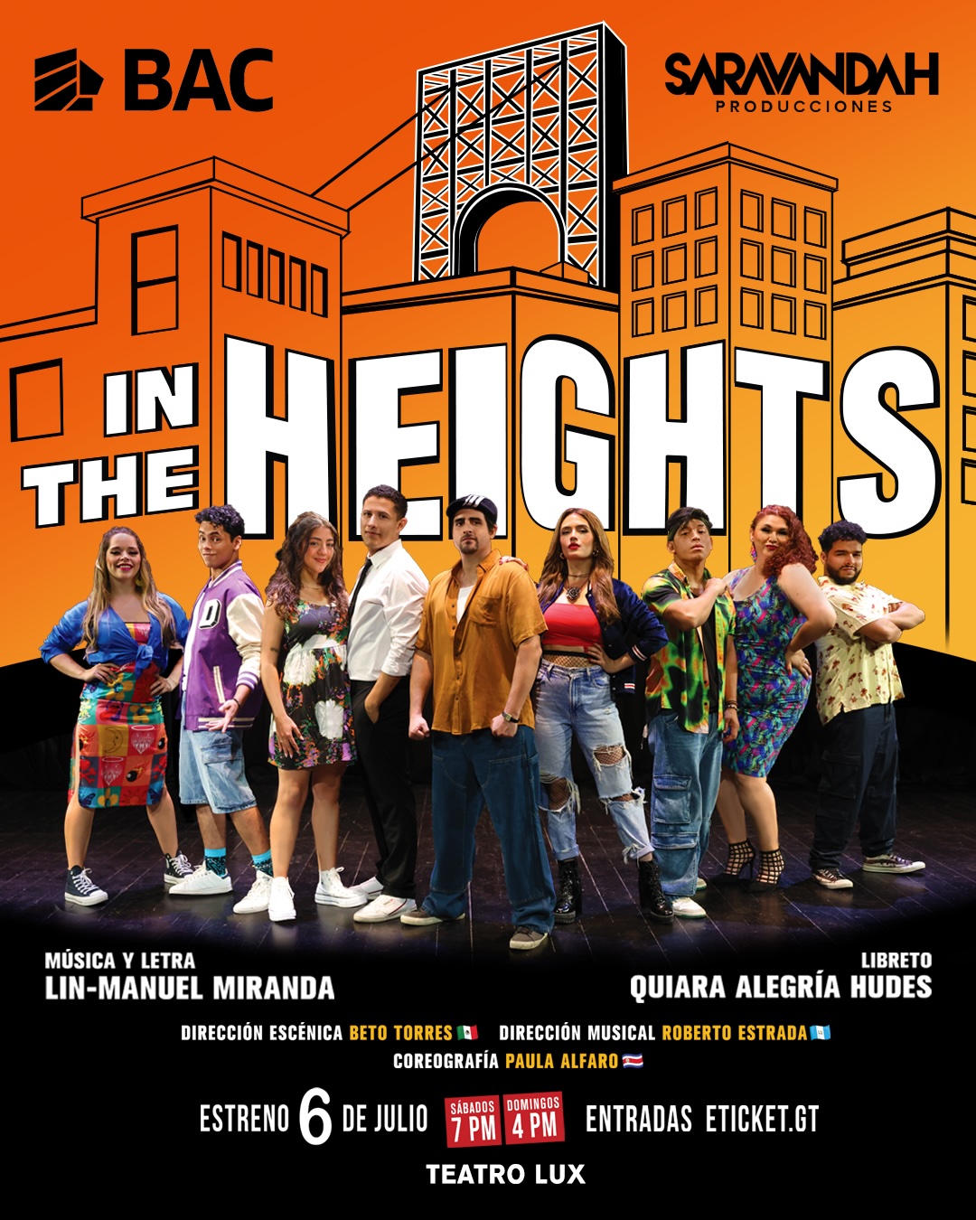 En colaboración con Saravandah Producciones, BAC se enorgullece en anunciar la llegada de un evento cultural que promete impresionar a todos los guatemaltecos. Creado por Lin-Manuel Miranda, actor y compositor reconocido por sus significativas contribuciones al teatro musical, “In The Heights” es un musical vibrante y emotivo que se presenta por primera vez en Guatemala y nos transporta al dinámico vecindario de Washington Heights en Nueva York.