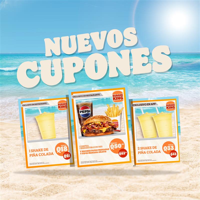 Cupones en la App: los usuarios que descarguen y se registren en la aplicación oficial de Burger King Guatemala podrán acceder a cupones exclusivos de los productos de verano, por tiempo limitado.