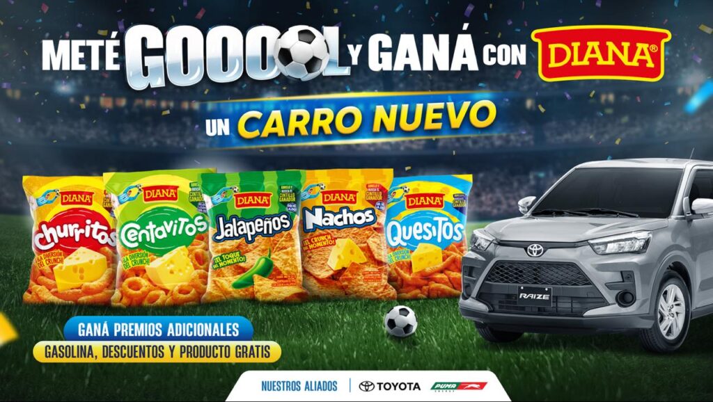 Queremos fortalecer nuestra conexión emocional con las personas y ser el aliado perfecto en cada partido y cada celebración”, expresó Alejandra Ríos, Category Business Owner para DIANA.La campaña “Meté gol y ganá con DIANA” está cargada con una gran promoción en la que los guatemaltecos podrán ganar premios como vales de gasolina en gasolineras PUMA, descuentos en tiendas de conveniencia Super7, mucho producto DIANA y por supuesto el gran premio, un carro Toyota RAIZE totalmente nuevo.