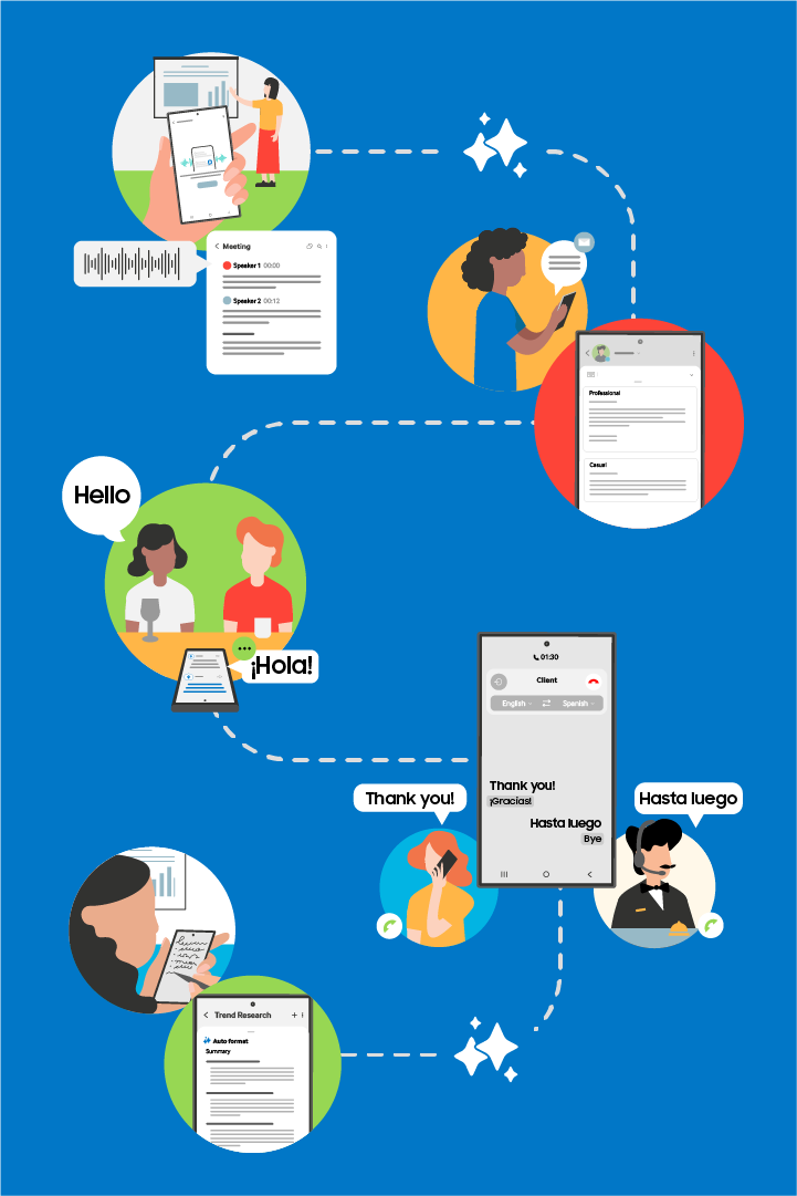 • Traducción bidireccional en tiempo real en conferencias telefónicas: Estás organizando una conferencia telefónica con un posible socio comercial de una empresa extranjera. Quieres que todo vaya lo mejor posible, pero te preocupan las barreras del idioma. Live Translate del Galaxy S24 traduce conversaciones telefónicas en tiempo real, lo que garantiza que serás tan claro, creativo y profesional con colegas o clientes extranjeros como lo serías en tu propio idioma. Ofrecido en 13 idiomas en el lanzamiento, Traducción simultánea proporciona traducción bidireccional en ambos dispositivos, incluso si una de las partes no está usando un Galaxy, o incluso un smartphone.