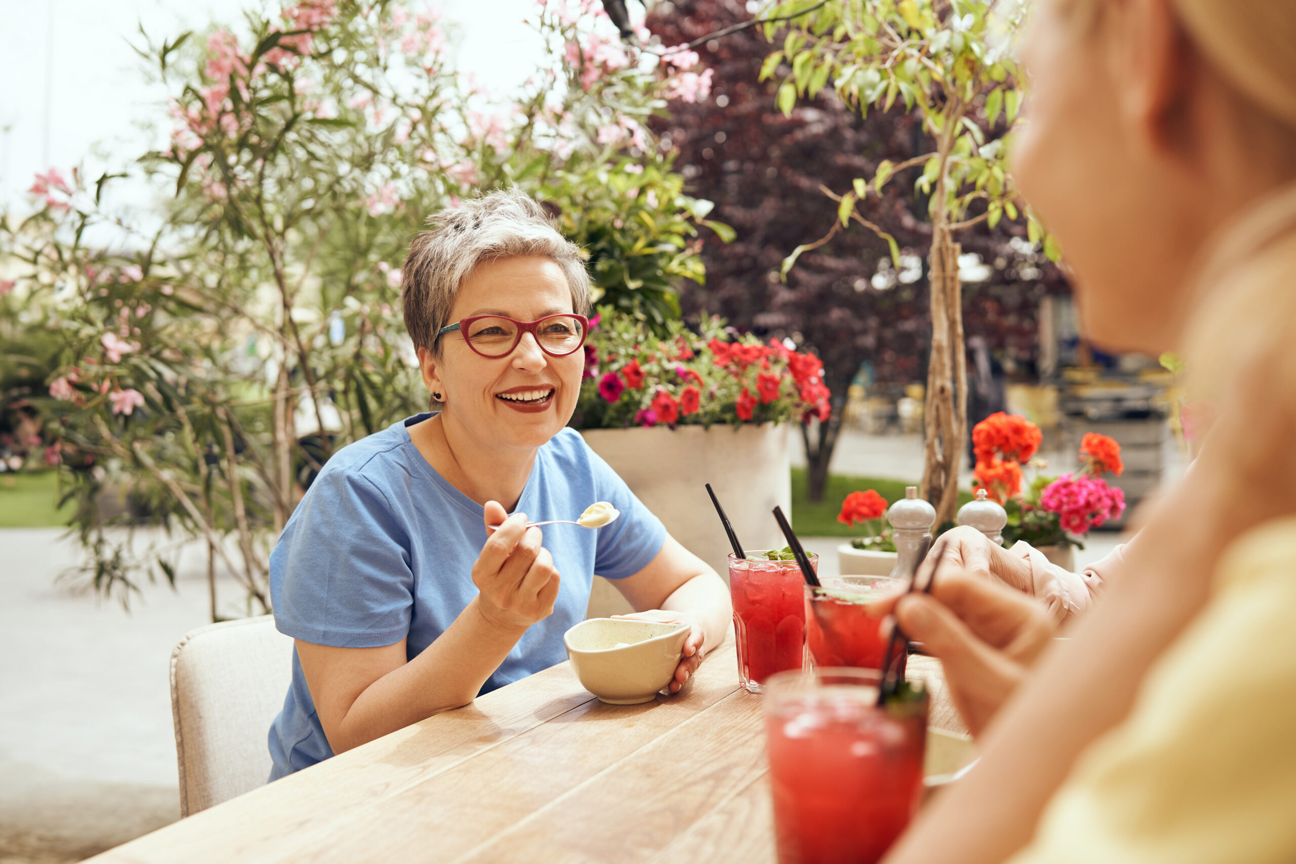 Mature female friends sitting in cafe, drinking coffee and cocktails while enjoying a lunch date