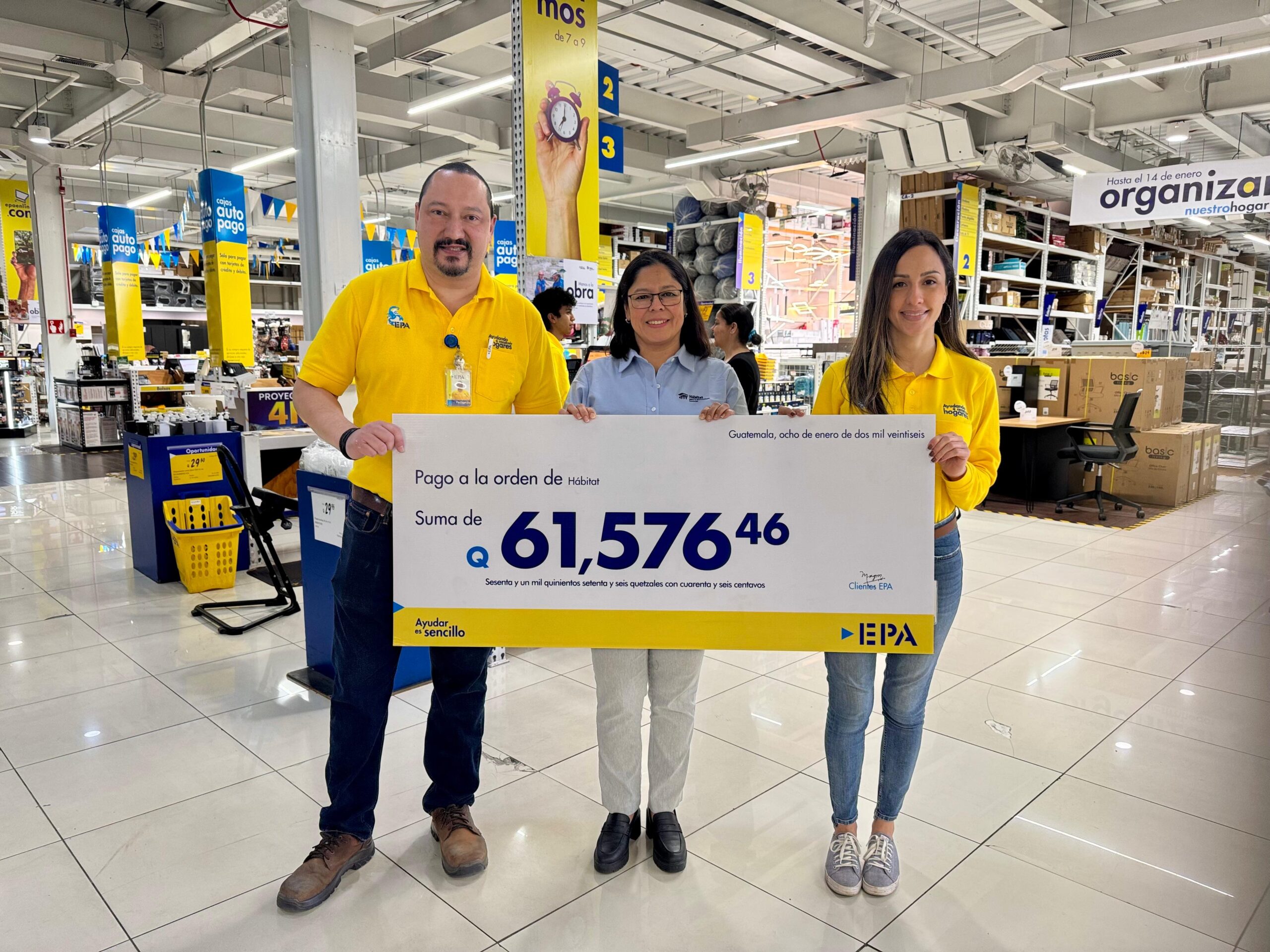 EPA por medio de su programa “Ayudar es Sencillo”, realizó el primer desembolso de Q61,576.46 a la organización Hábitat para la Humanidad Guatemala en beneficio del proyecto “Manos a la Obra”.