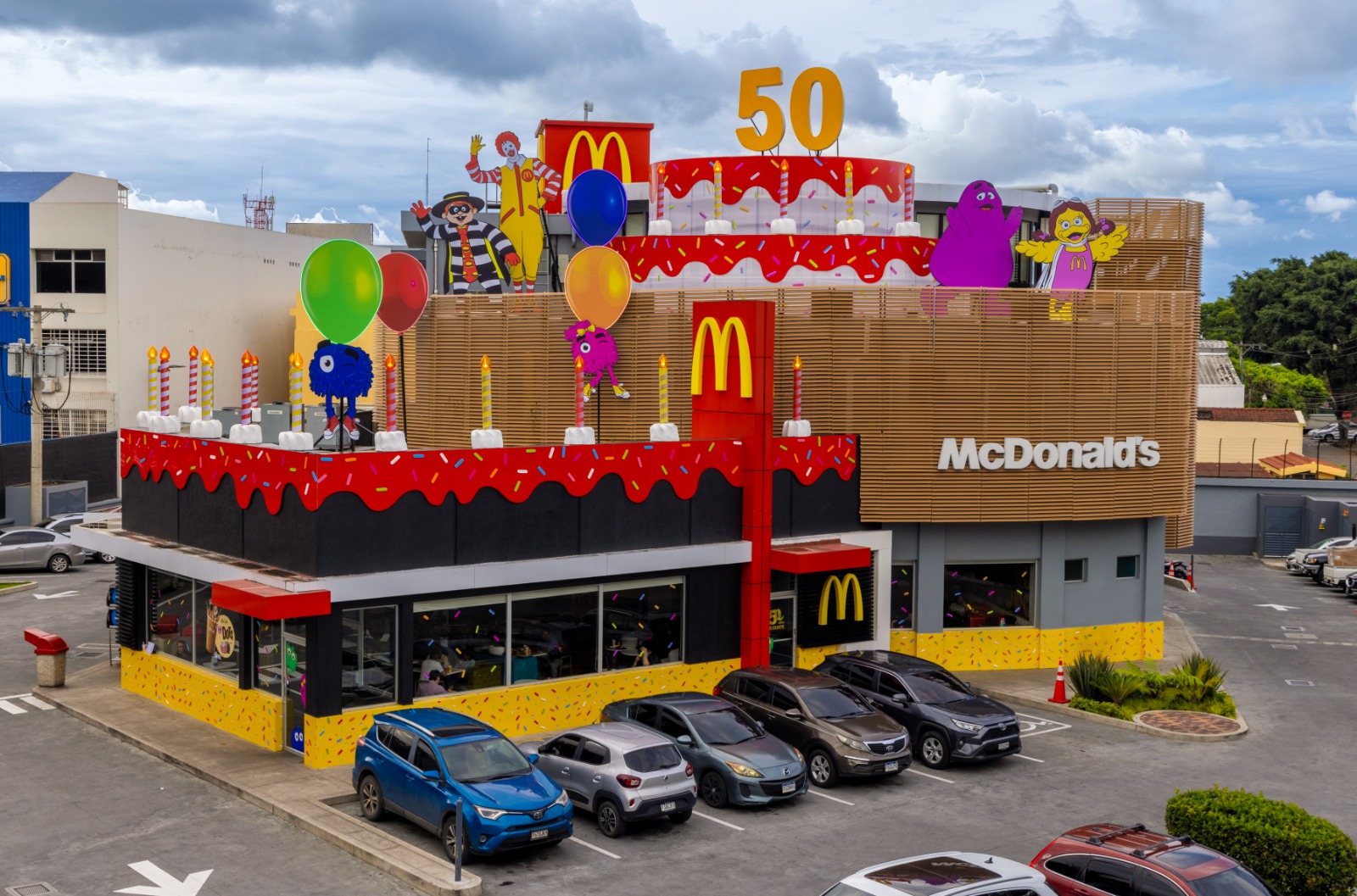 Este restaurante con escenario temático multiplicará sonrisas, puesto que traerá lindos recuerdos a niños y adultos. La fachada se encuentra adornada con un espectacular diseño de pastel gigante en donde sobresale el número 50, acompañado de los queridos personajes de McDonald’s: Ronald McDonald, Pajarita, Comebatidos, Robaburguesas y McPapitas.