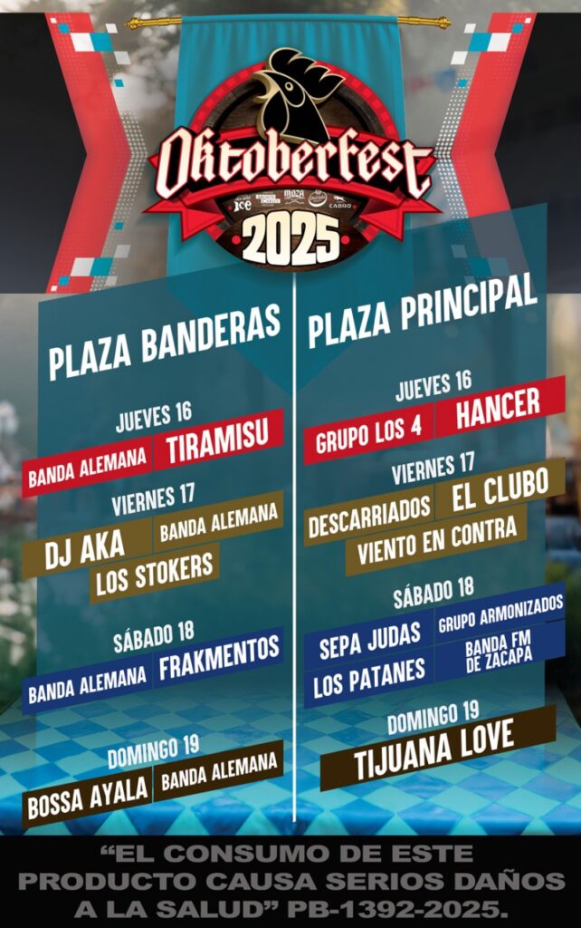 El Oktober Fest 2025 se llevará a cabo desde el jueves 16 de octubre al domingo 19, en las Plazas Central y de la Bandera de Ciudad Cayalá, con acceso libre para el público y actividades desde la tarde hasta la medianoche.