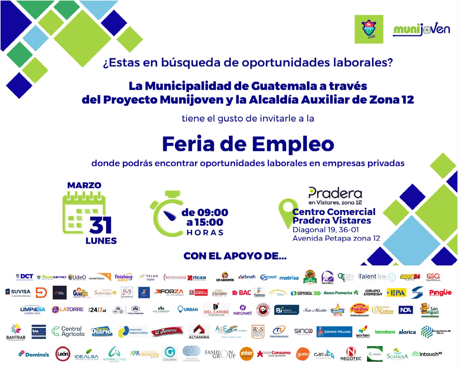 Pradera en Vistares y MUNIJOVEN, una iniciativa de la Municipalidad de Guatemala con el respaldo del Programa de las Naciones Unidas para el Desarrollo (PNUD), anuncian la segunda Feria de Empleo, que tendrá lugar en el centro comercial el lunes, 31 de marzo, en el sótano 2 de Pradera en Vistares, en un horario de 9:00 a 15:00 horas.