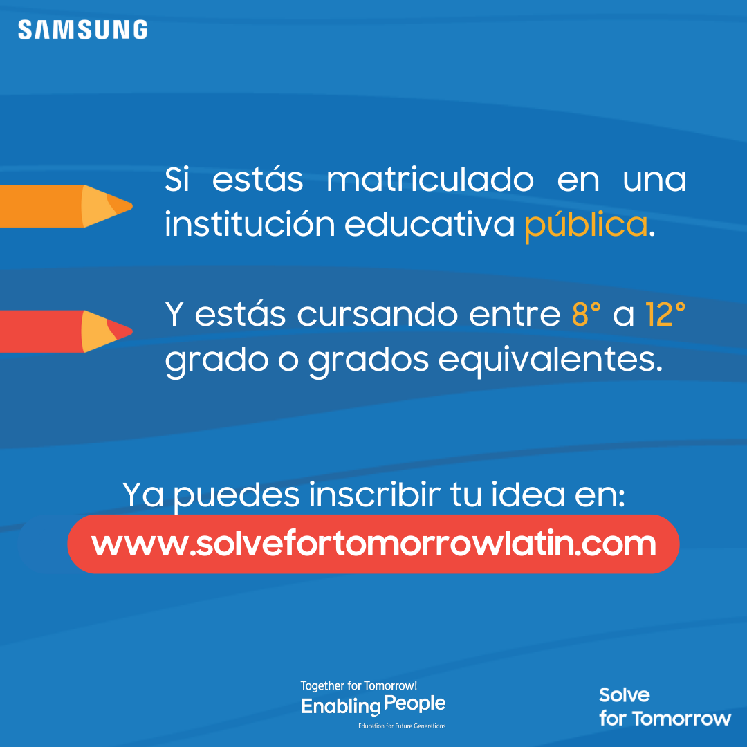 Para dar la oportunidad a más estudiantes de la región, el programa Solve for Tomorrow 2024 de Samsung Electronics extendió una semana el período de inscripciones y por consiguiente el cierre será el 28 de junio, para la región conformada por Centroamérica, el Caribe, Ecuador y Venezuela.  Así, jóvenes de entre 15 y 19 años de edad, que, como tú quieren ser parte de esta experiencia educativa y de crecimiento personal y grupal, pueden activarse ideando un proyecto para solucionar un problema o necesidad de sus comunidades. Una vez que lo hayan definido, deben entrar al sitio web  https://solvefortomorrowlatin.com/ y seguir el sencillo procedimiento para formalizar la postulación.